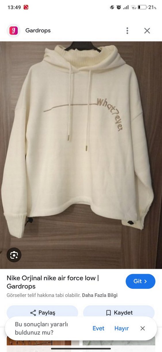 beyaz sweatshirt, uzun kollu ve yuvarlak yaka. Rahat kesimi ve yumuşak kumaşıyla günlük kullanıma uygun, sade 'whatever' detayıyla şık ve rahat.