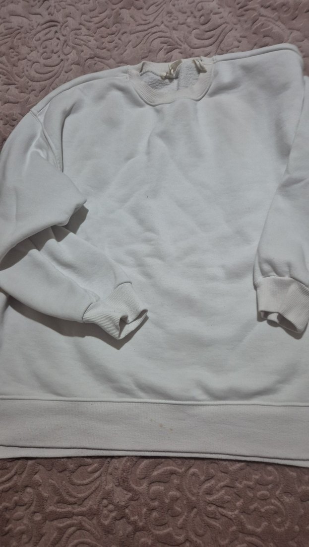 Beyaz, bisiklet yaka ve uzun kollu kadın sweatshirtü, salaş kesim ve yumuşak, sıcak kumaşla. Düz tasarımıyla rahat sokak stili için uygundur.