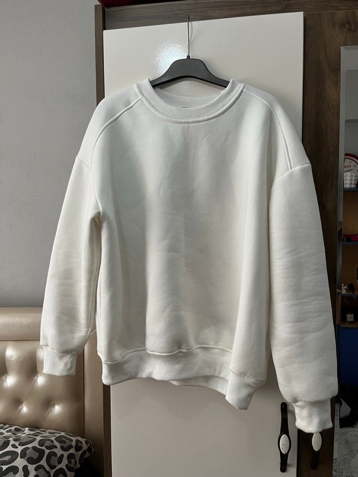 Beyaz renkte, uzun kollu ve yuvarlak yakalı kadın sweatshirtü. Rahat kesimi ve yumuşak, sıcak dokusuyla günlük kullanıma uygundur. Desensiz, normal boyda, sade ve rahat tarzda.