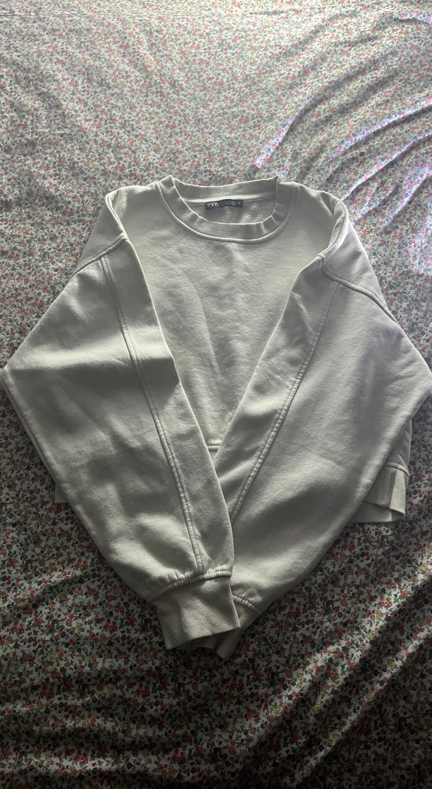 Beyaz renkte, yuvarlak yakalı ve uzun kollu kadın sweatshirtü. Salaş kesimi ve normal midi boyu ile rahat bir kullanım sunar. Desensiz, yumuşak keten kumaştan üretilmiş, günlük kullanım için uygun, konforlu bir sokak stili.
