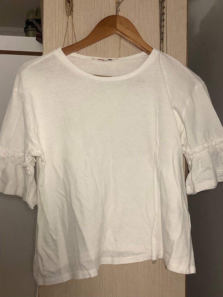 Beyaz Kadın Tişört, Kısa Kollu, Fırfırlı
