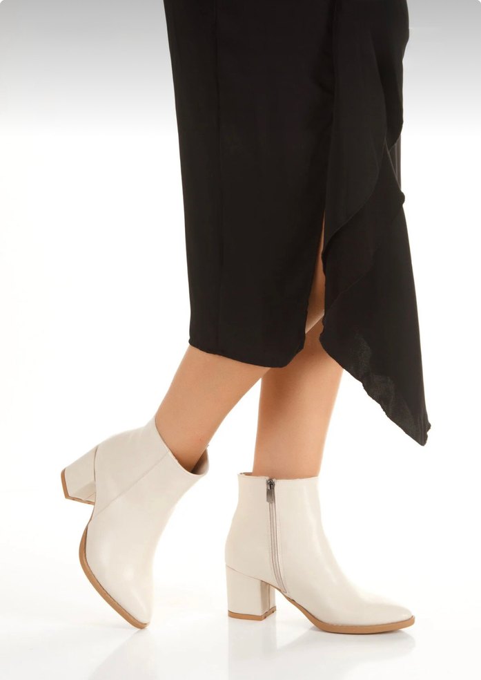 Beyaz, blok topuklu kadın bilekte bot. Minimalist ve desensiz tasarımıyla günlük kullanıma uygun, rahat ve şık görünümlü.