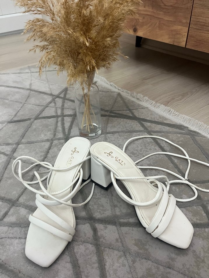 Dantel detaylı, gri desenli beyaz blok topuklu sandalet. Minimalist ve bohem tarzda, düğün için uygun kauçuk malzeme.