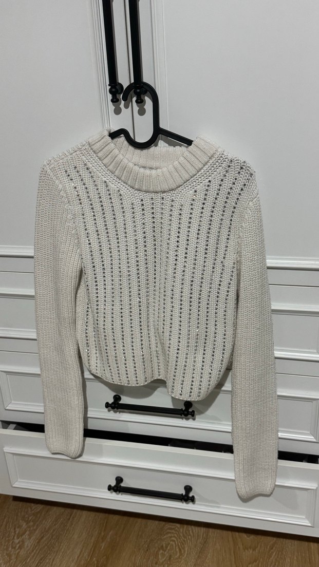Bu beyaz triko kazak, bisiklet yaka ve uzun kolludur. Günlük kullanım için rahat ve sade bir şıklık sunar. Normal boyu ve örgü dokusu konfor sağlar. Üzerinde taşlar şıklığınıza şıklık katıyor ve çok sıcak tutacaktır sadece denedim hiç kullanılmadı