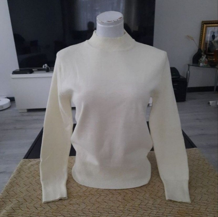 Beyaz renkli, bisiklet yaka ve uzun kollu kadın triko kazak. Yumuşak ve sıcak dokuma kumaştan, vücuda oturan ve normal boyda, günlük rahat kullanım için ideal. İki koltuk arası 44 cm / Boy 59 cm