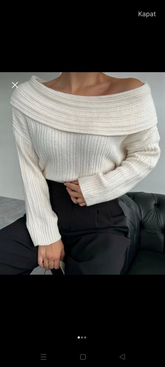 Beyaz triko keten kumaştan, kayık yaka ve uzun kollu. Bol kesim ve normal boyda, günlük rahatlık ve sokak stili için uygun.