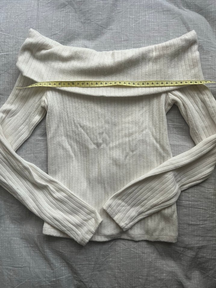 Beyaz, kayık yaka ve uzun kollu, üst bir kere giyildi