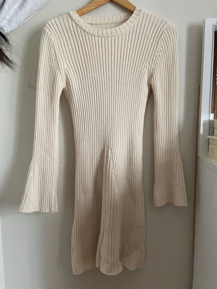 Beyaz renkte, uzun kollu ve bisiklet yaka, vücuda oturan triko midi elbisedir. Rahat ve günlük kullanıma uygundur. Standart bedendir