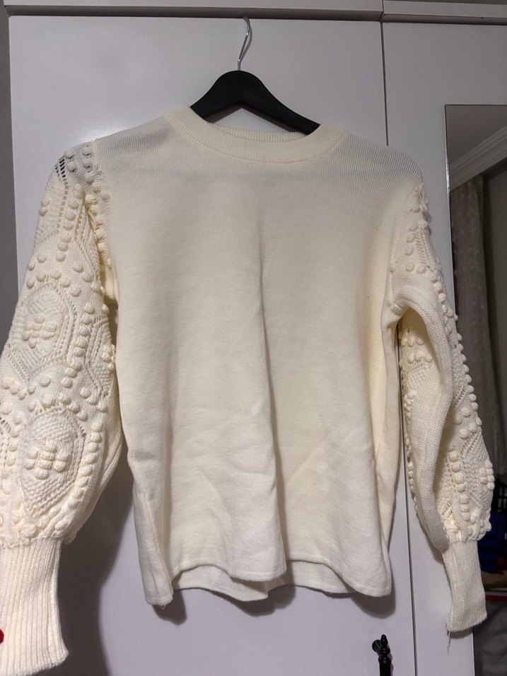 Beyaz renkli, uzun kollu, triko örgü detaylı ve yuvarlak yakalı kadın kazak. Rahat kesim ve midi boy ile günlük sokak stiline uygun.
