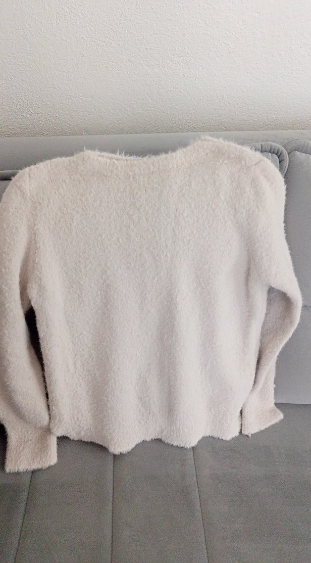 Beyaz renkte, yuvarlak yakalı, uzun kollu, yumuşak dokulu örme kadın sweatshirt. Rahat, normal boy ve bol kesimdir, günlük kullanım için uygundur.