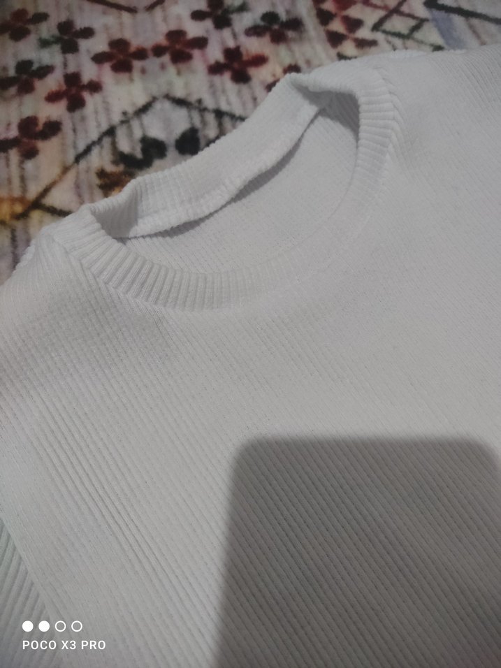 Beyaz,çizgili penye kadınt thishirt yuvarlak yaka ve uzun kolludur. Rahat sentetik kumaştan, sade ve normal boydadır, günlük kullanım için uygundur. ikili fiyat
