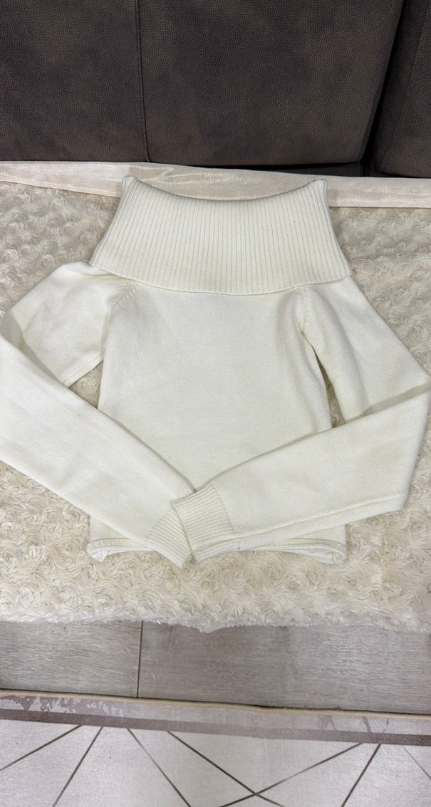 Beyaz, uzun kollu, tekne yaka kadın kazak. Yumuşak triko kumaştan, vücuda oturan kesimde, gündelik kullanıma uygun sade tasarım.