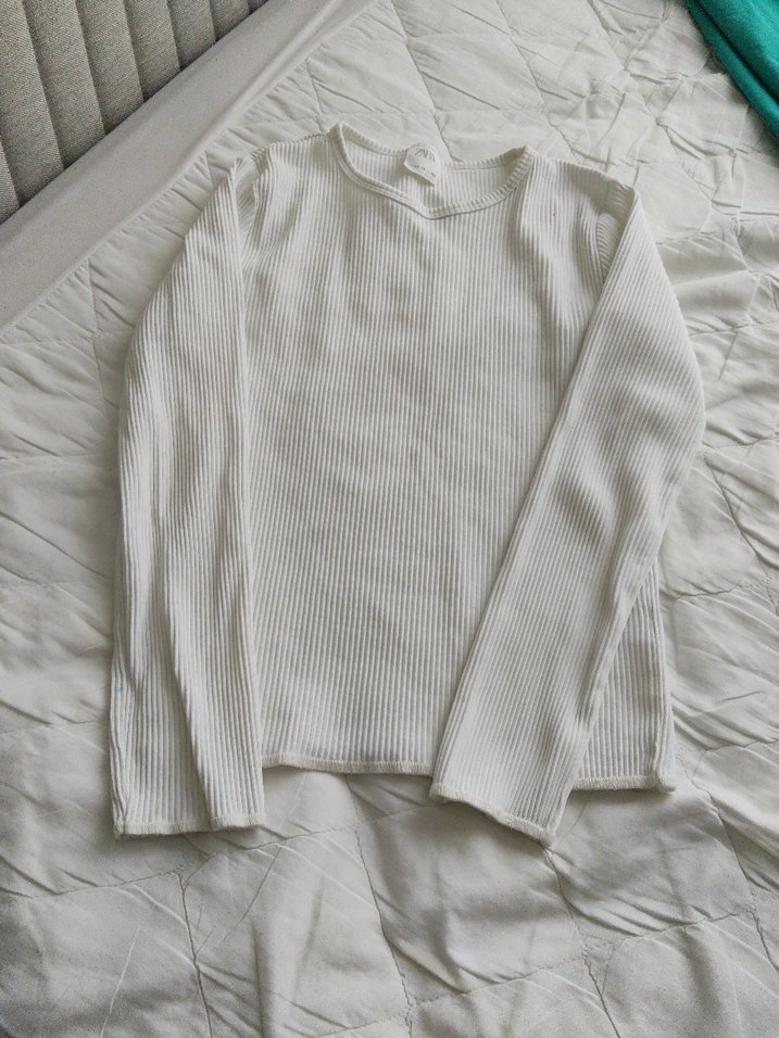 Yumuşak keten kumaştan, beyaz, örme uzun kollu, bisiklet yaka ve bol kesim triko. Desensiz, günlük kullanıma uygun sade tasarım.
