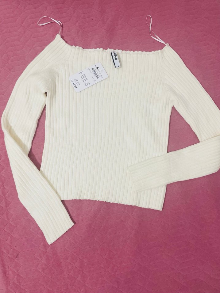 Beyaz, uzun kollu, kayık yaka, triko kumaştan yapılmış, vücuda oturan rahat bir bluz. Günlük kullanım için uygundur. Pageone marka, ihracat fazlası orjinal triko.