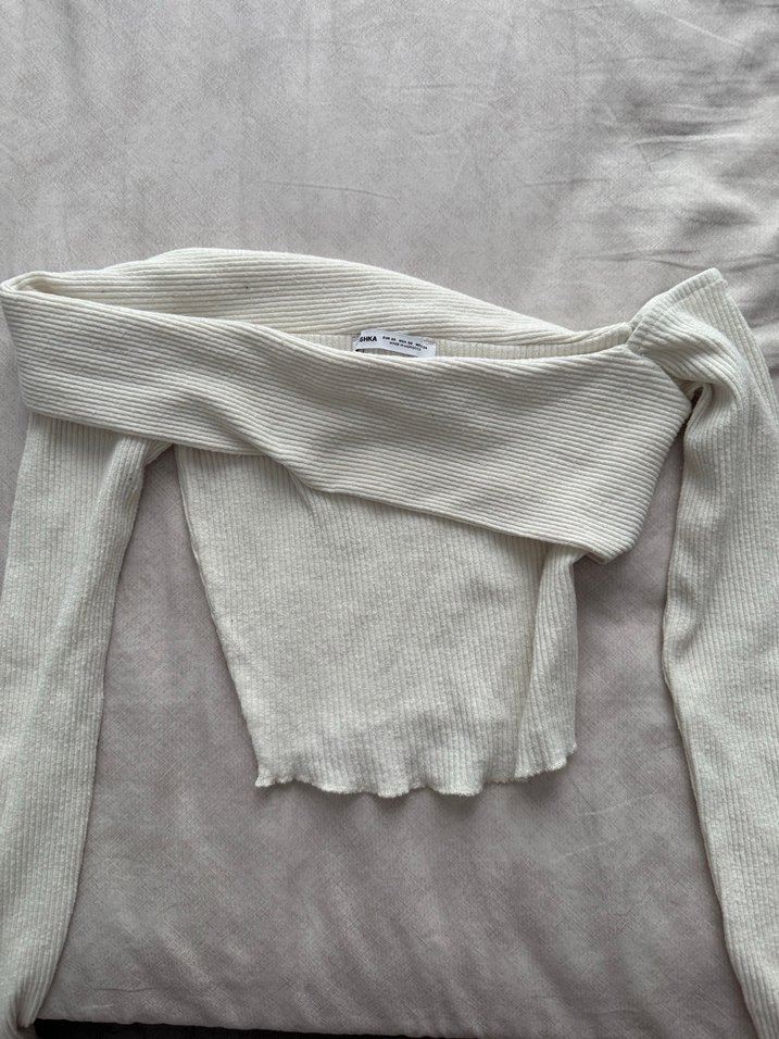 Beyaz, uzun kollu ve kayık yakalı kadın triko kazak. Örme keten kumaştan yapılmış, rahat ve sade tasarıma sahip, günlük kullanıma uygundur. Midi boyda, desensiz ve sokak stilinde.