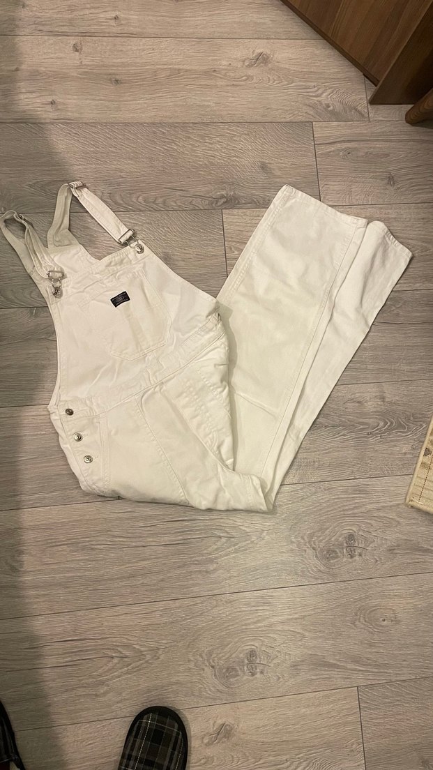 Yumuşak kumaştan yapılmış, ayarlanabilir askılı, beyaz bol kesim midi uzunlukta kadın tulumu.