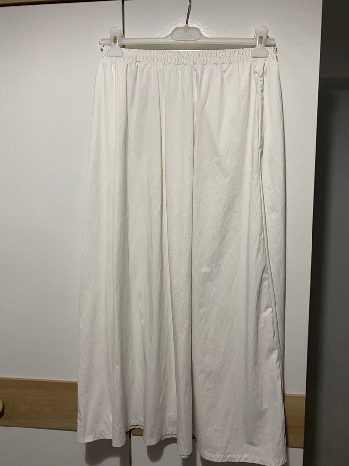 Beyaz uzun etek, keten kumaştan ve bol kesimlidir. Drapeli tasarımı ve sade stili günlük kullanıma uygundur.