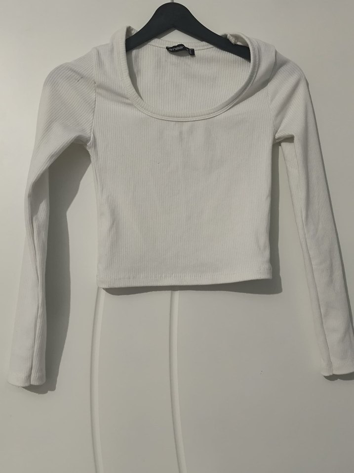 Beyaz crop top, uzun kollu ve yuvarlak yakalıdır. Yumuşak keten kumaştan yapılmış, sade ve minimal tarzda, günlük kullanıma uygundur.