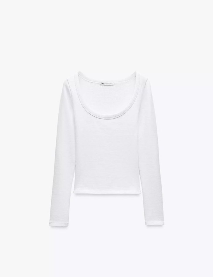 Beyaz renk, yuvarlak yakalı ve uzun kollu kadın crop top, yumuşak keten kumaştan üretilmiş, günlük kullanıma uygun sade ve dar kesim.