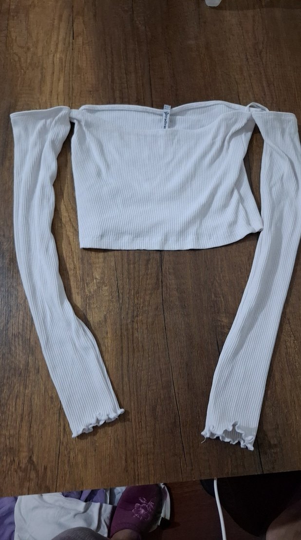 Yumuşak keten kumaştan, uzun kollu ve tek renk beyaz, minimalist tarza sahip, günlük kullanıma uygun fitted crop top.