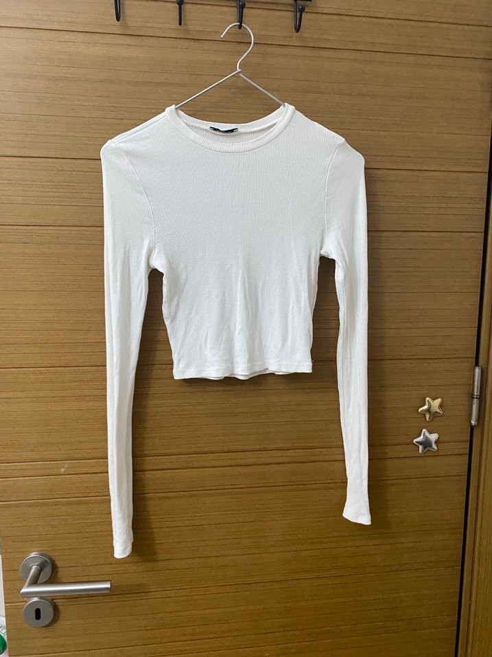 Beyaz, uzun kollu, dar kesim crop top. Yuvarlak yaka ve sade tasarımı ile gündelik kullanım için uygun, hafif keten kumaştan üretilmiştir.