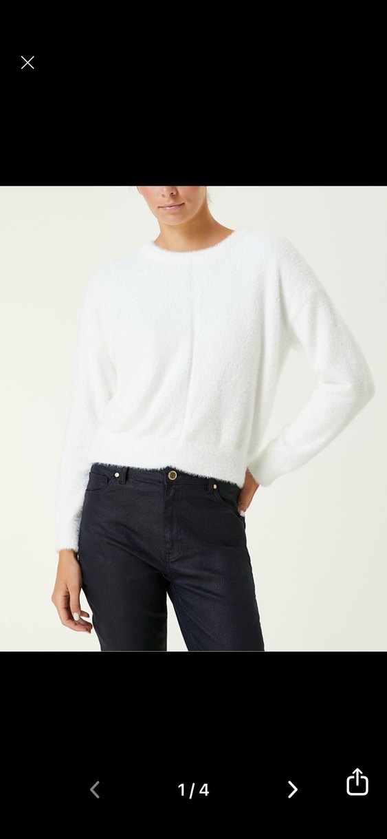 Beyaz pamuklu kazak, yuvarlak yaka ve uzun kollu, rahat ve salaş kesimlidir. Günlük kullanım için sade ve şık bir görünüm sunar. Midi boydadır.