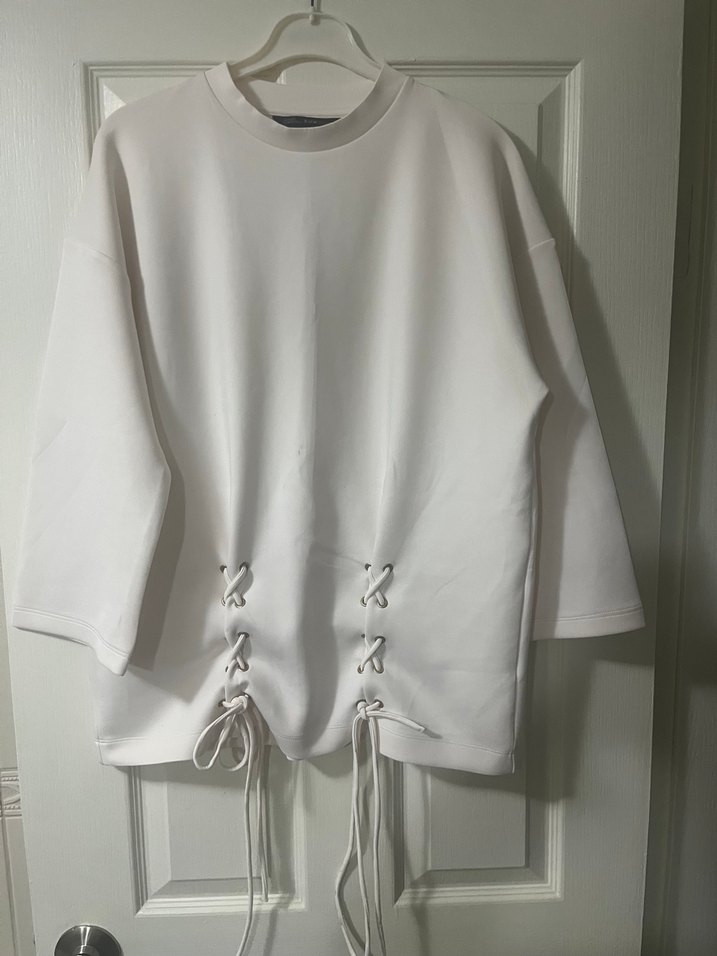 Yumuşak sentetik kumaştan, uzun kollu, yuvarlak yaka, bol kesim beyaz sweatshirt. Ön kısmında bağcıklı detaylar bulunur. Günlük kullanıma uygundur.