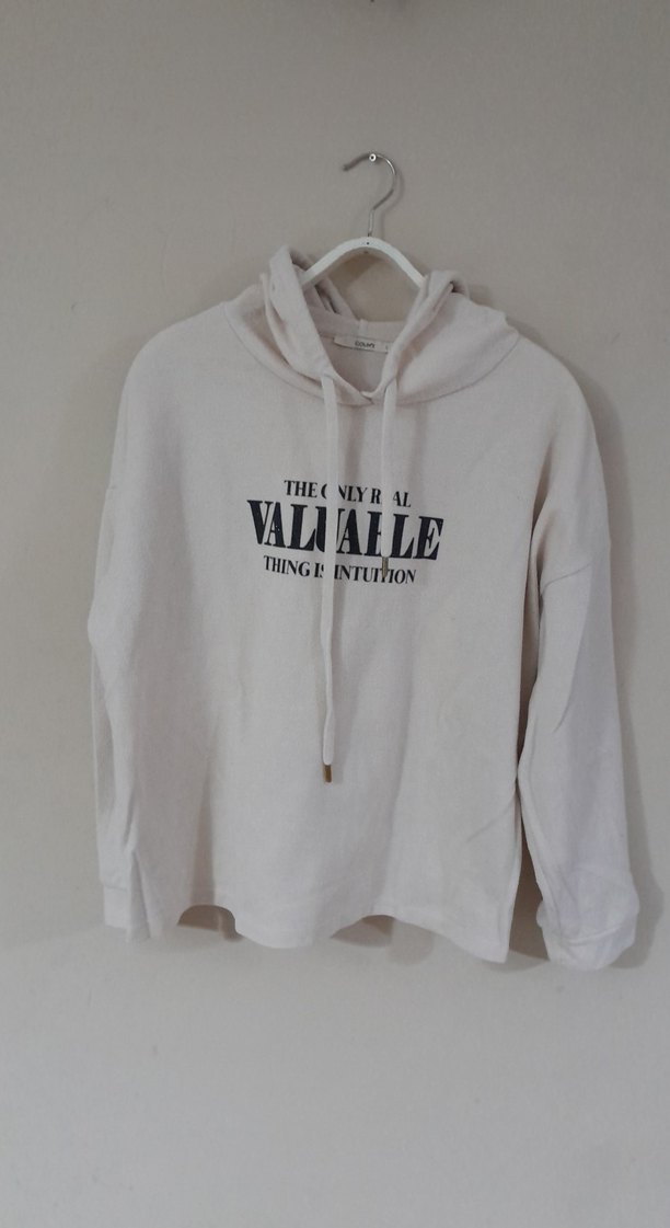 Beyaz renkli, uzun kollu ve yüksek yakalı kadın sweatshirtü. Hafif keten kumaştan, bol kesim ve baskılı tasarım ile günlük rahatlık sunar.