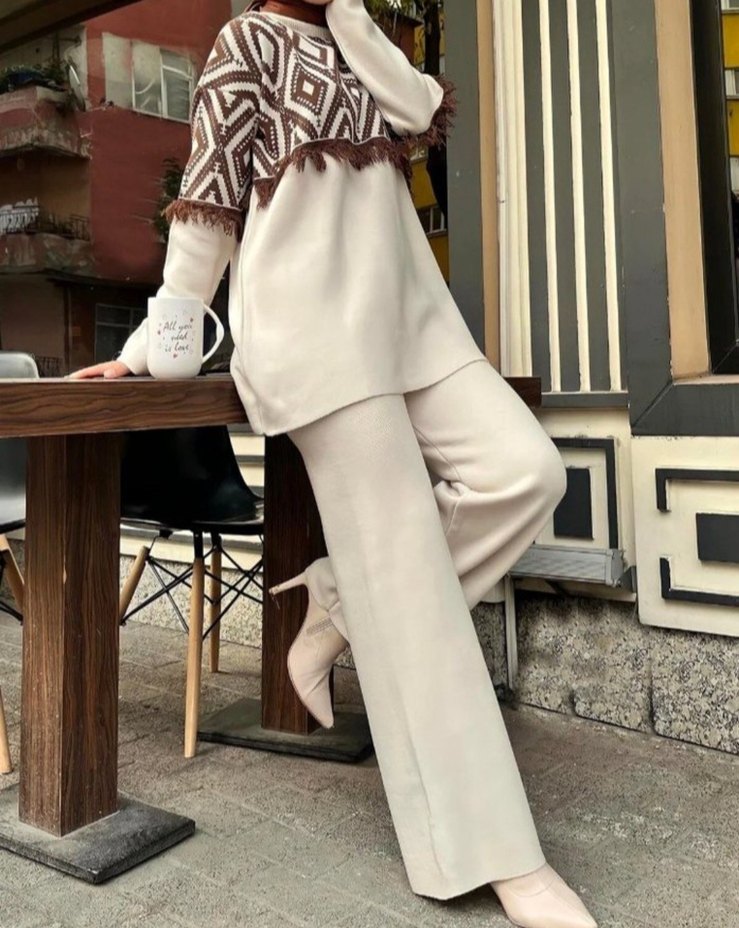 Yüksek yakalı, uzun kollu, açık renkli batik desenli ve kürklü detaylı tunik ile geniş paça pantolondan oluşan kadın takım elbise. Yumuşak sentetik kumaştan, günlük kullanıma uygun rahat ve şık.