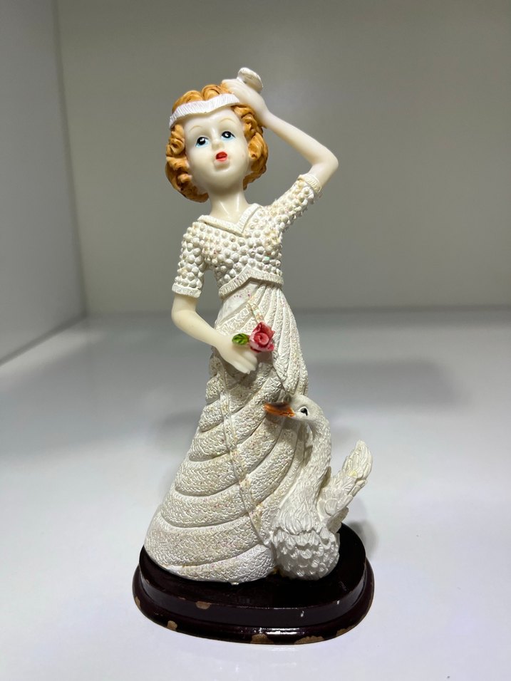 Dokulu elbise giymiş, elinde gül tutan kadın ve yanında kuğu figürlü beyaz biblo, koyu renk taban üzerinde duruyor.