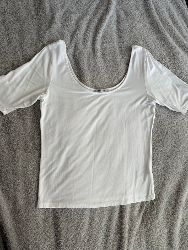 Yumuşak pamuktan yapılmış, yuvarlak yaka ve yarım kollu beyaz kadın tişörtü. Salaş kesimi ve normal boyu ile günlük sokak stiline uygundur.
