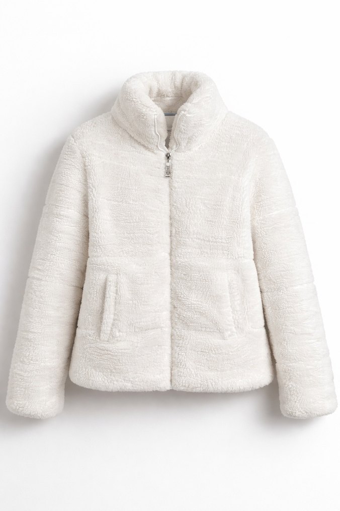 Kadınlar için uzun kollu, yüksek yakalı ve bol kesimli, yumuşak ve sıcak dokulu beyaz renkli düz desensiz ceket. Günlük kullanım için uygundur.