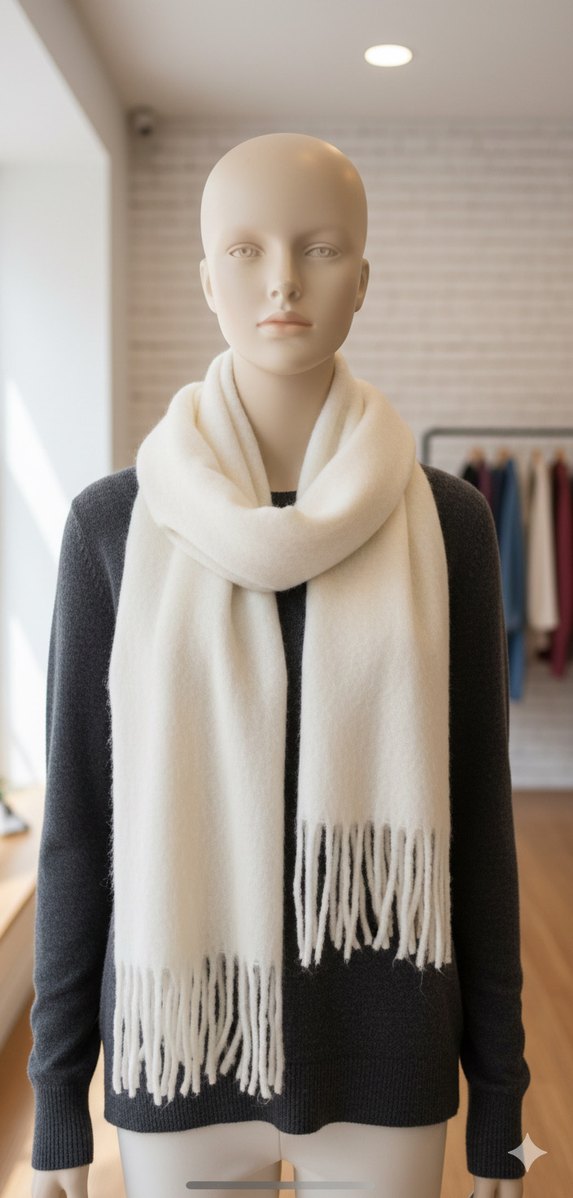 Yumuşak kürk detaylı ve püsküllü kenarlı beyaz yün şal, rahat ve bohem tarz sunar. Retro ve hippie görünüme uygundur. ❄️ Yenidir