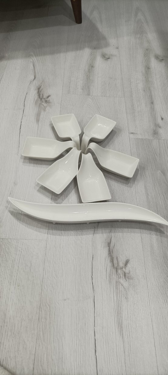Beyaz kahvaltı seti porselen, altı küçük kare tabak ve bir uzun kavisli tabaktan oluşur, atıştırmalık ve soslar için uygundur. ️