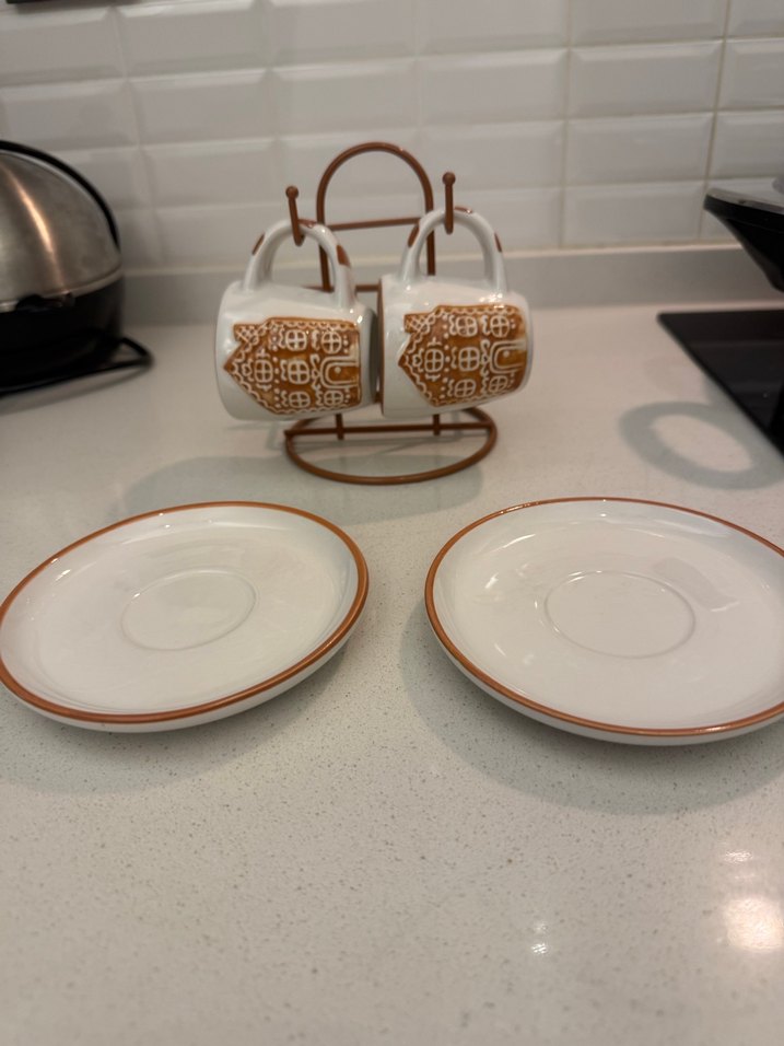 İnce altın desenli beyaz kahve fincanları ve uyumlu tabaklardan oluşan set, espresso veya Türk kahvesi için uygundur. ☕