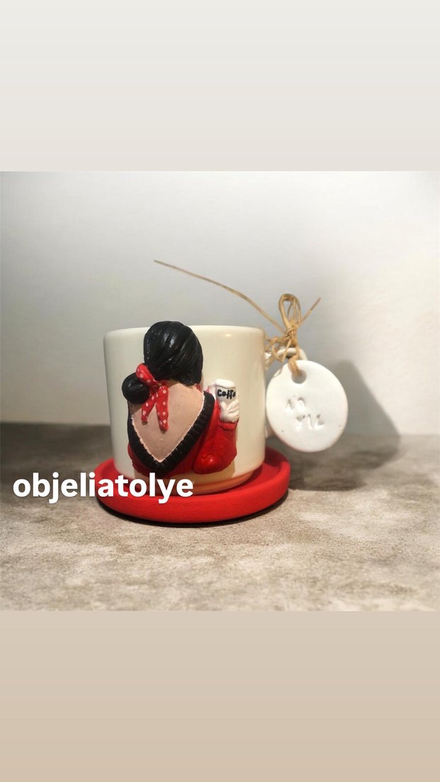 Su bazlı verniklidir her renk her model yapılır Kahve tutan kadın figürlü beyaz fincan, kırmızı tabanlı ve ip bağlamalı yuvarlak beyaz etiketli.