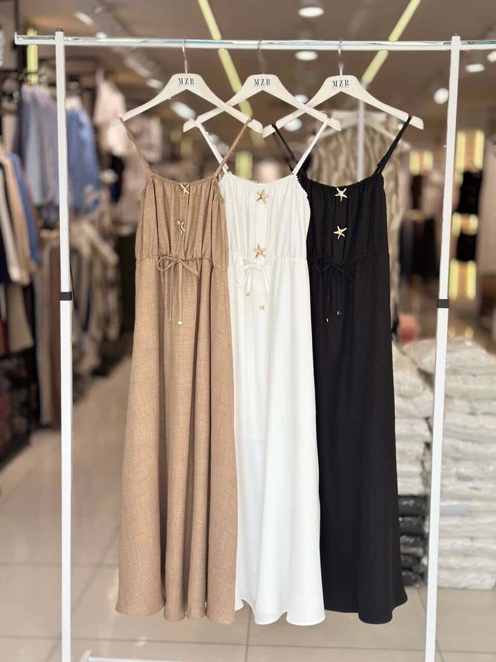 Beyaz-Kahve-Siyah ip askılı Uzun Keten Elbise