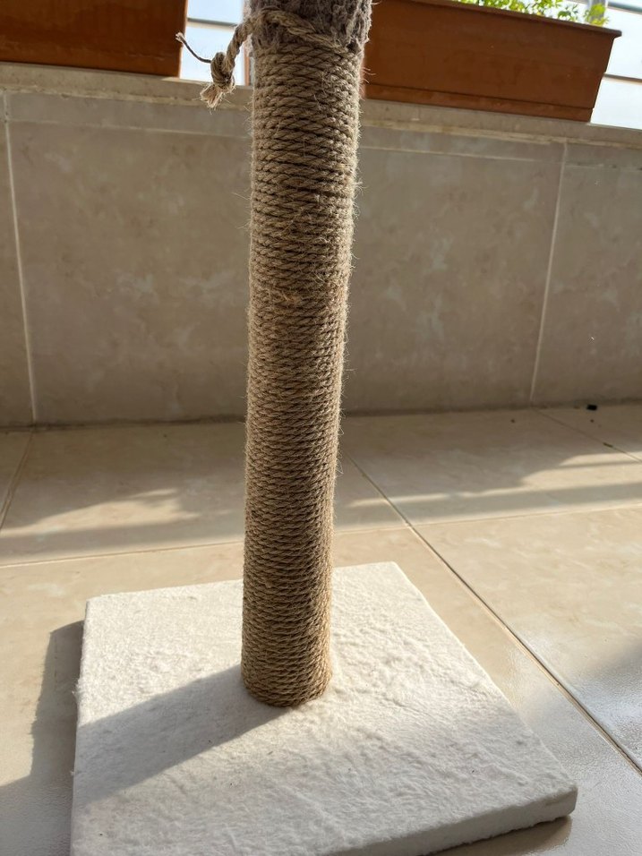 Beyaz kaideli, gri ip sarılı dikey direğe sahip kedi tırmalama direği. Kedilerin tırmalaması için sağlam yüzey sağlar.