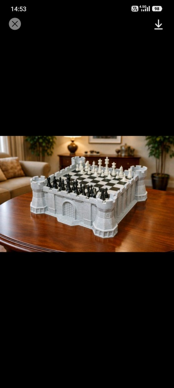 Beyaz kale tasarımına sahip satranç seti, köşelerde kule detayları ve siyah-beyaz taşlarla klasik oyun deneyimi sunar. ♟️