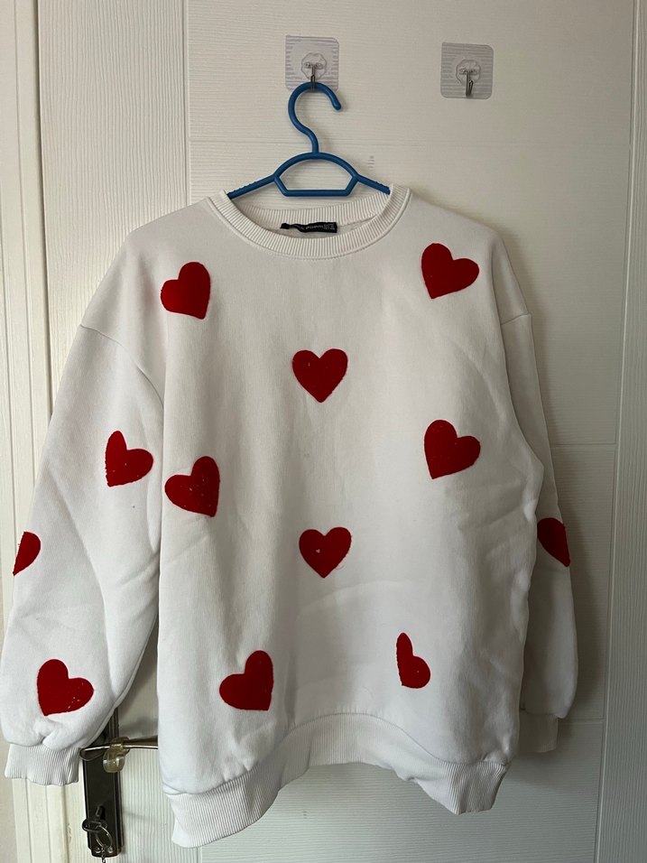 Beyaz, uzun kollu, yuvarlak yakalı, bol kesim ve kırmızı kalp desenli kadın sweatshirt. Yumuşak, örgü kumaştan rahat bir his verir. ❤️