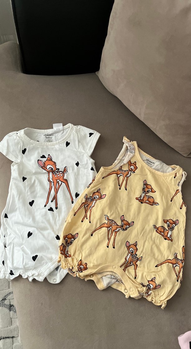 Beyaz renkli, sevimli geyik ve siyah kalp desenli baskılı kız bebek tulumu, yumuşak kumaştan üretilmiştir.