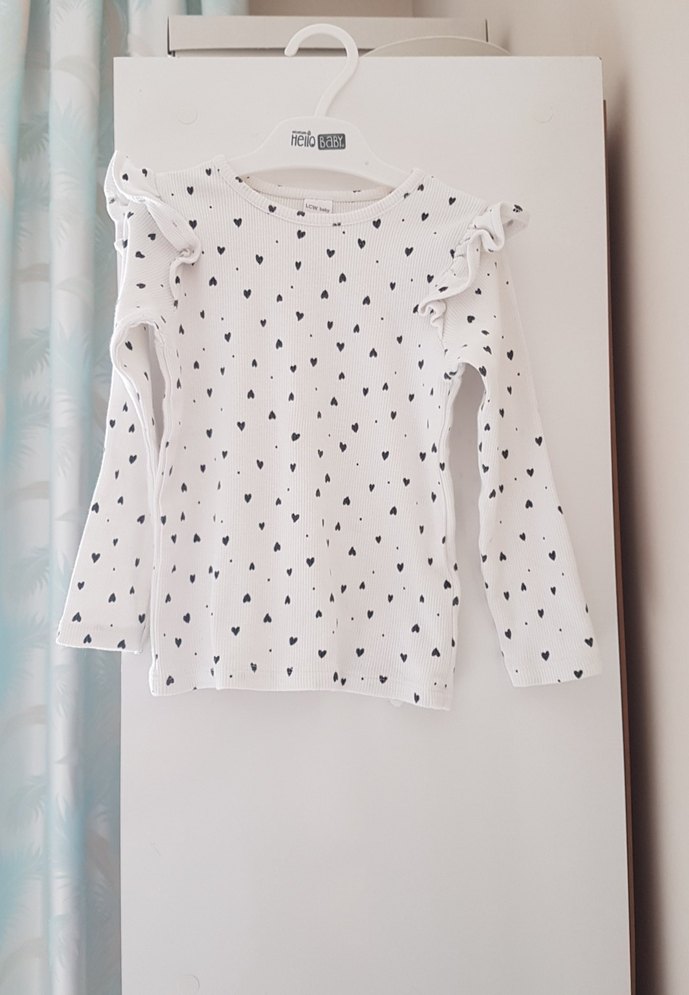 Uzun kollu, yuvarlak yaka ve bol kesim beyaz kız bluzu. Pamuk kumaştan, kalp desenli ve omuzlarda fırfır detaylı. Rahat sokak stili için uygundur.