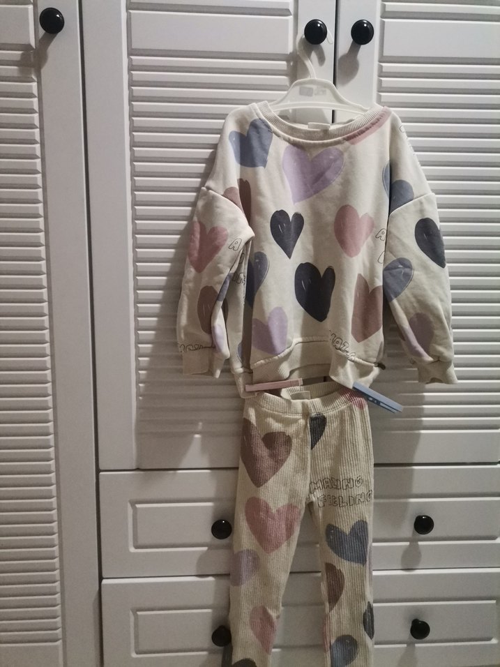 Beyaz renkli, kalp desenli kız eşofman takımı, bol kesim, uzun kollu, yuvarlak yaka ve örme yumuşak kumaştan yapılmıştır. Rahat ve şık görünüm sağlar.