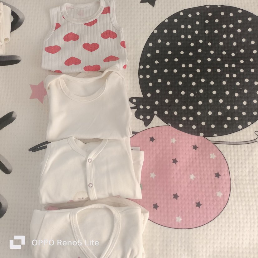 Pastel beyaz zemin üzerine kırmızı kalp desenli, kolsuz, yuvarlak yakalı ve düğmeli bebek zıbını. ve alt üst takım