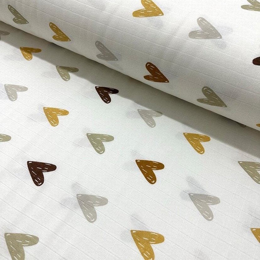 Yumuşak müslin kumaştan, açık beyaz zemin üzerine sıcak tonlarda kalp desenli kumaş 1 metre