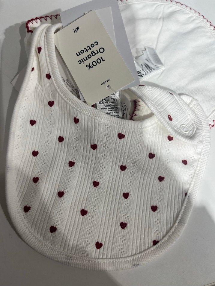 Küçük kırmızı kalp desenlerine sahip beyaz bebek önlüğü, %100 organik pamuktan üretilmiştir. Yumuşak ve nefes alabilir kumaş bebeğiniz için konfor sağlar.