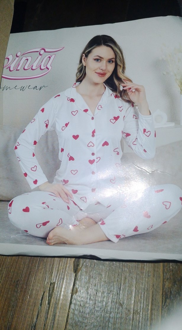 Uzun kollu, beyaz üzerinde kırmızı kalp desenli, rahat kesim pijama. Konforlu ve sokak modası tarzında. ❤️