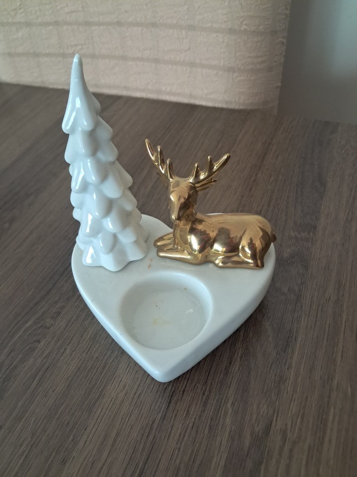 Beyaz kalp şeklinde mumluk, üzerinde açık renkli çam ağacı ve altın renkli geyik figürü bulunur. ️