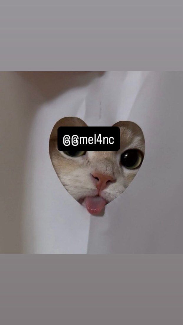 Kalp şeklinde kesilmiş beyaz kedi aksesuarı, dilini çıkaran bir kedinin yüzü görünüyor, üzerinde '@@mel4nc' yazısı mevcut.