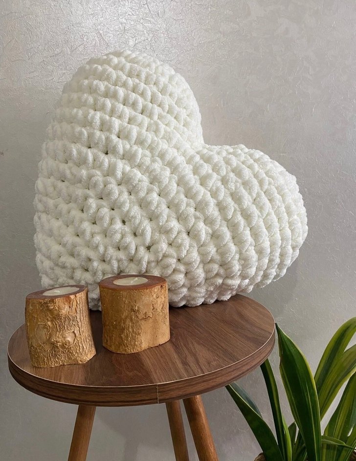 Kalın örgü dokusuyla beyaz, kalp şeklinde yumuşak yastık, her odaya sıcaklık katar. ❤️